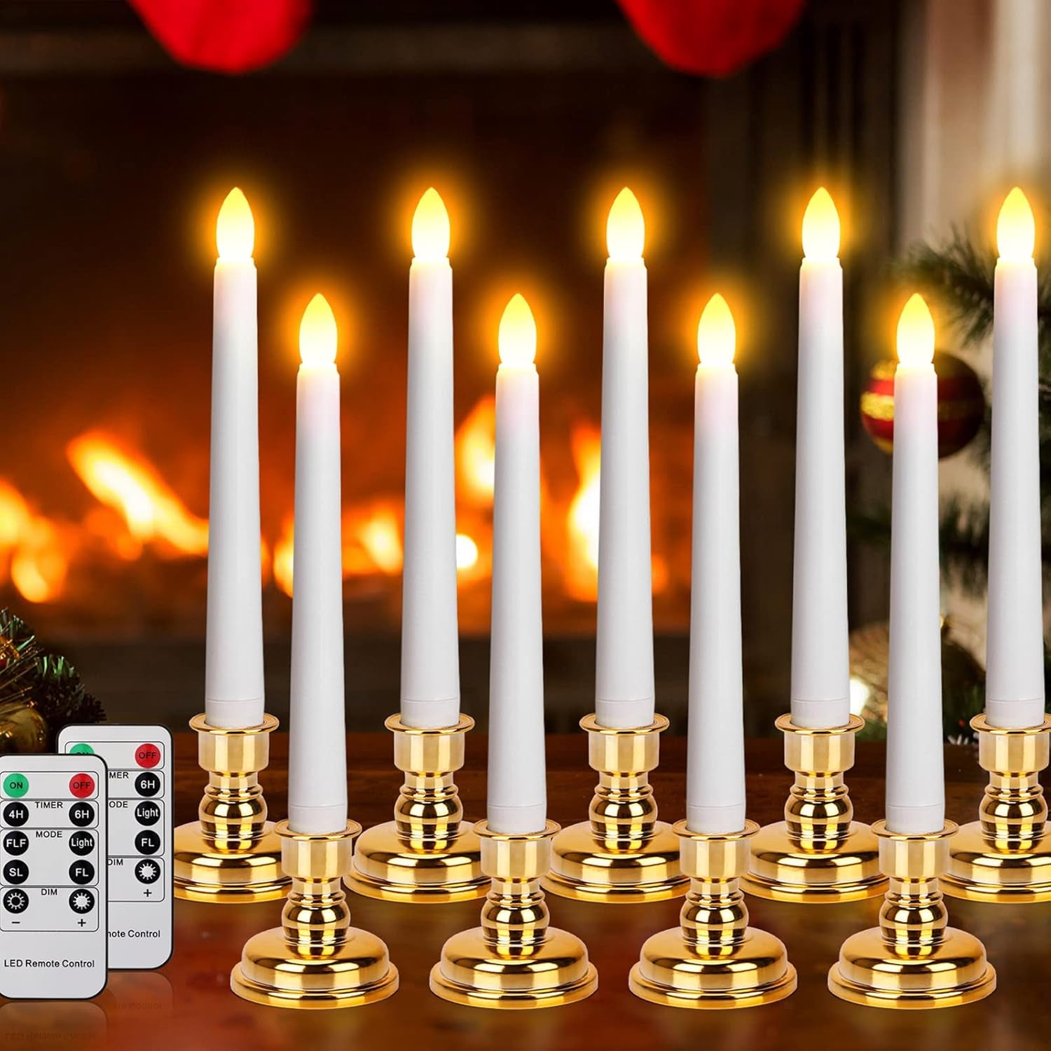 LED Flameless Flickering Taper Candles with Remote & Timer Warm Light Battery Operated Christmas Window Candle for Wedding Party Holiday Home Table Decoration (9 Packs,White+Gold Holder(A))…