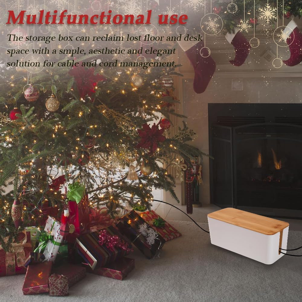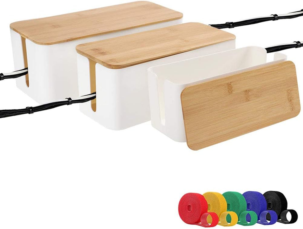 [Set of Three] Cable Management Box Organizer, Bamboo Lid Large Storage Wires Holder for Home, Office, Desk, TV, Computer - Great to Cover Hide Tidy Surge Protector & Power Strips & Cords (White)